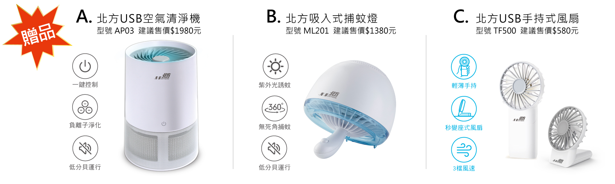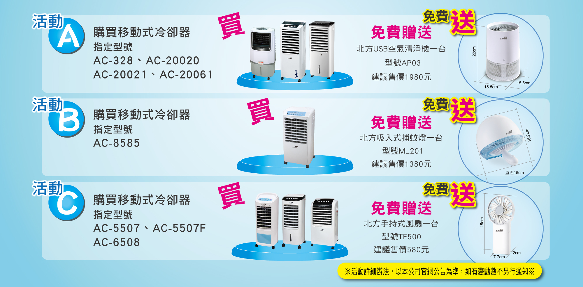 購買登錄活動中任一款北方移動式冷卻器只要再加120元即可獲得北方TF500座/握兩用扇一支,建議售價580元,恕不挑色,購買一台僅限加購一次