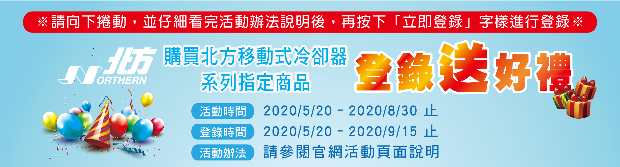 1.凡於活動期間內 (2020/05/20 08:00 – 2020/08/30 23:59) 購買北方指定系列移動式冷卻器,並在指定登錄期間於實體通路或網路商城購買該產品且未辦理退貨之消費者,上網登錄個人資料、上傳產品序號照片及購買發票照片,可享有贈品資格。(注意:發票上需載明購買品名、數量、購買日期,上傳之照片內容需清晰可辨識,如有內容不清楚、或購買日期不在活動時間內、任何竄改、資料造假等欺騙行為發生,本公司將自動取消兌換資格,同時依法追究法律責任)。若未於登錄截止時間內完成登錄,即視為自動放棄參加活動資格,不得要求登錄延期或參加活動,亦不得要求額外以其他方式獲得活動贈品。