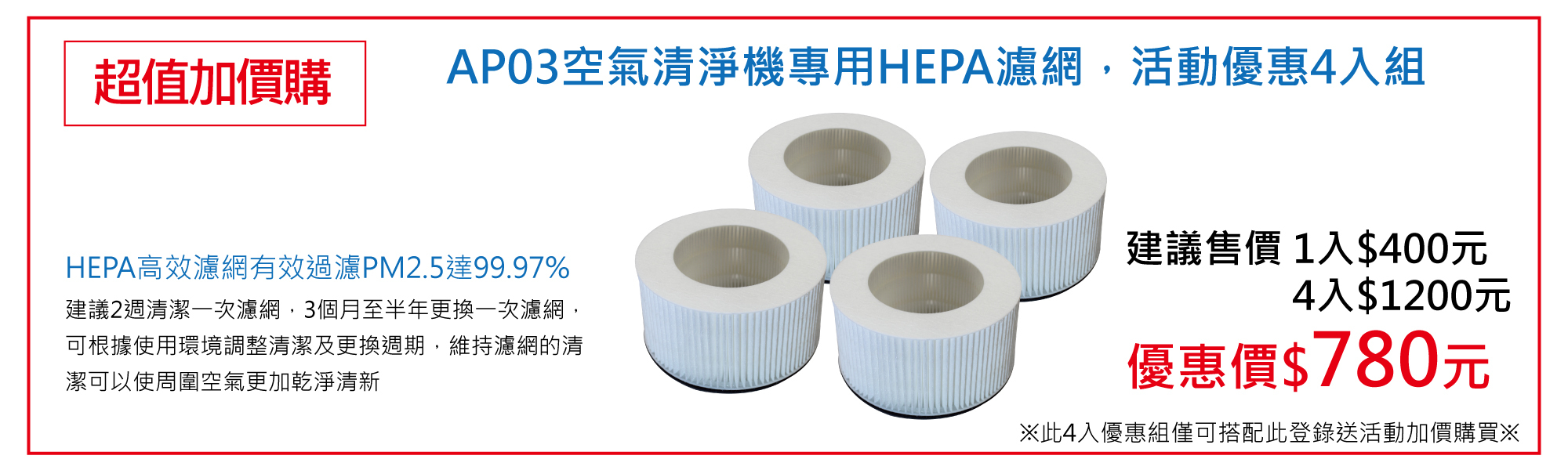 2.如有參加AP03空氣清淨機_HEPA濾網加價購之消費者,可享有不需支付贈品作業處理費新台幣70元之優惠