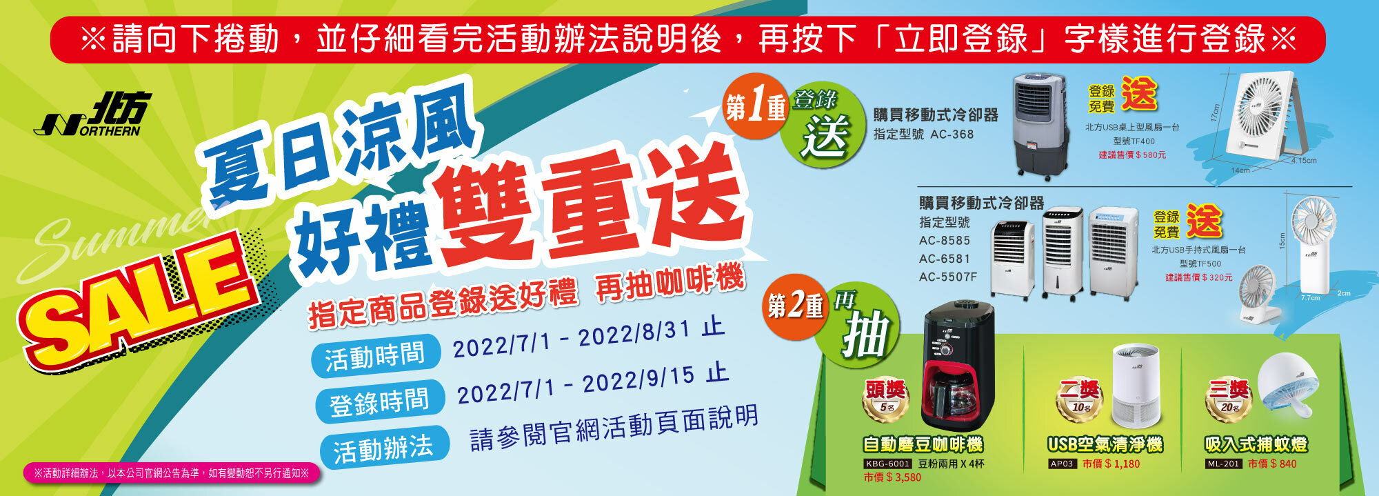 1.凡於活動期間內 (2022/07/01 08:00 – 2022/08/31 23:59) 購買北方指定系列移動式冷卻器,並在指定登錄期間於實體通路或網路商城購買該產品且未辦理退貨之消費者,上網登錄個人資料、上傳產品序號照片及購買發票照片,可享有贈品資格。(注意:發票上需載明購買品名、數量、購買日期,上傳之照片內容需清晰可辨識,如有內容不清楚、或購買日期不在活動時間內、任何竄改、資料造假等欺騙行為發生,本公司將自動取消兌換資格,同時依法追究法律責任)。若未於登錄截止時間內完成登錄,即視為自動放棄參加活動資格,不得要求登錄延期或參加活動,亦不得要求額外以其他方式獲得活動贈品。