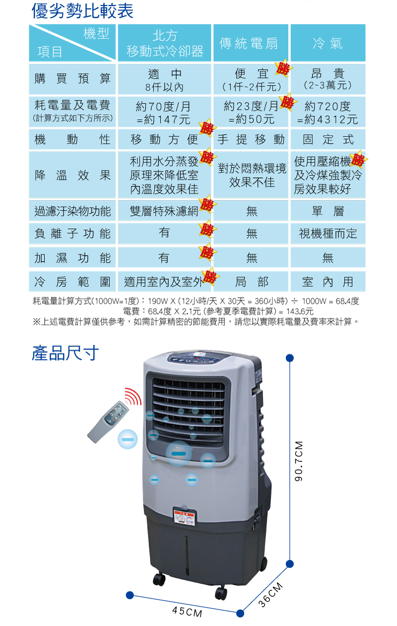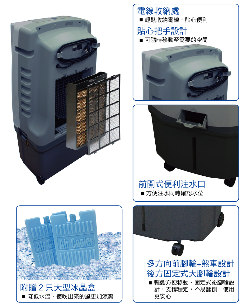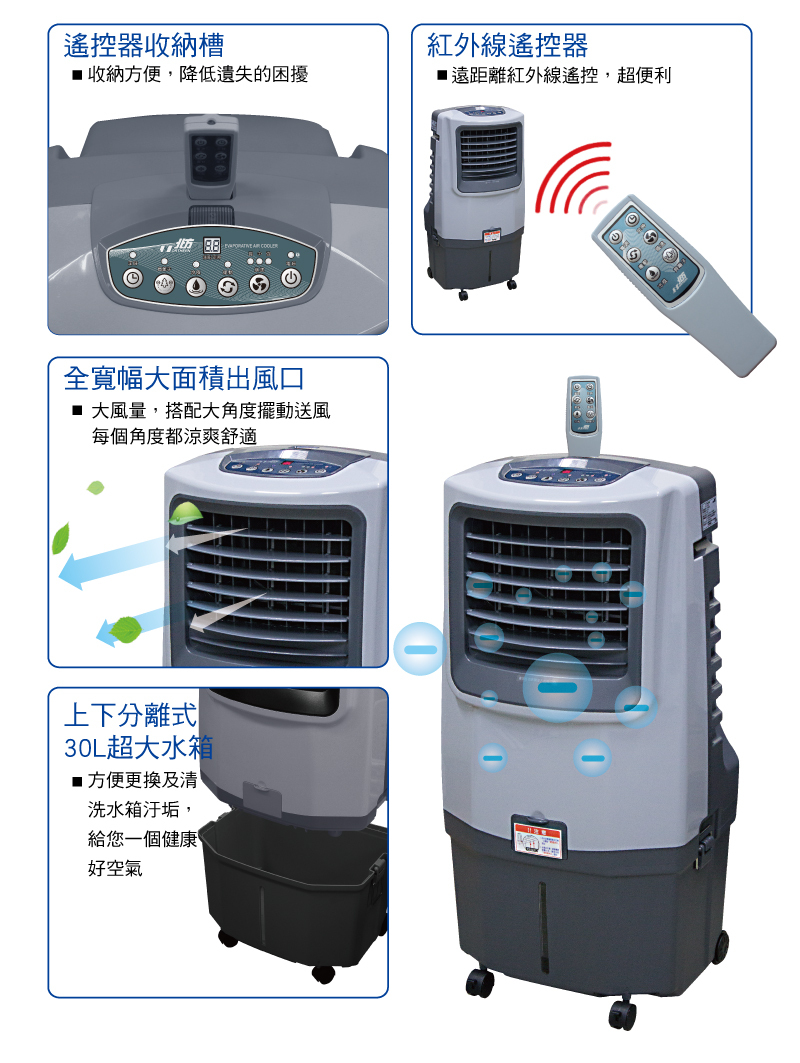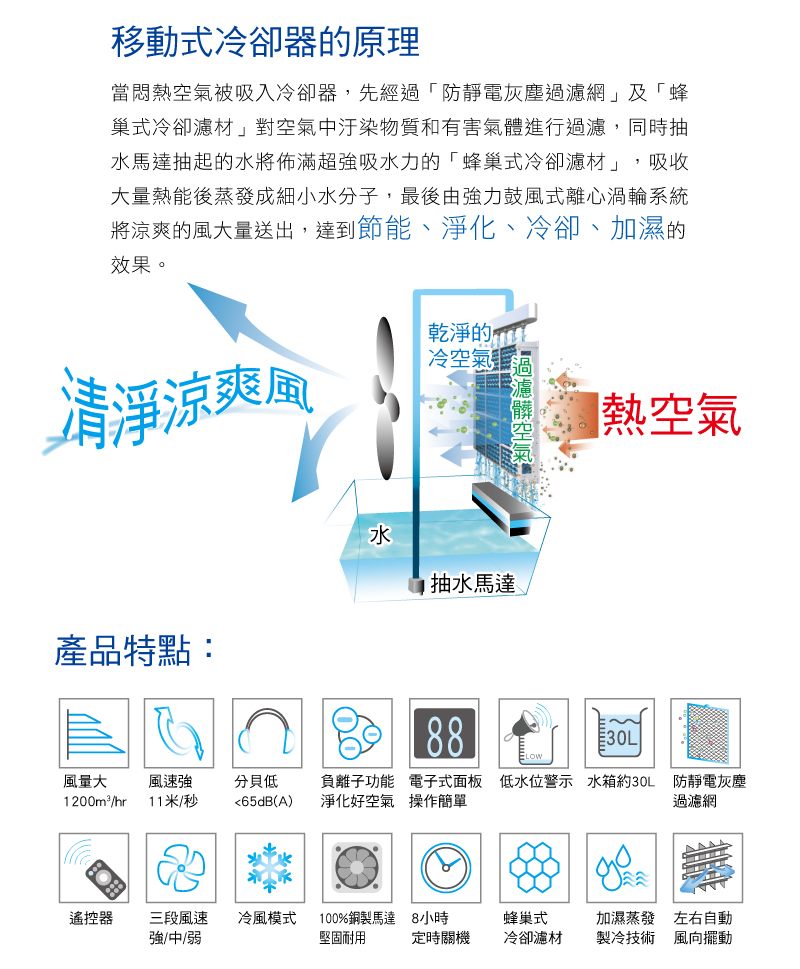 ●負離子功能 淨化空氣●加濕蒸發製冷技術●8小時定時關機●低水位警示系統●左右自動風向擺動●雙重過濾網,過濾汙染空氣●紅外線遙控