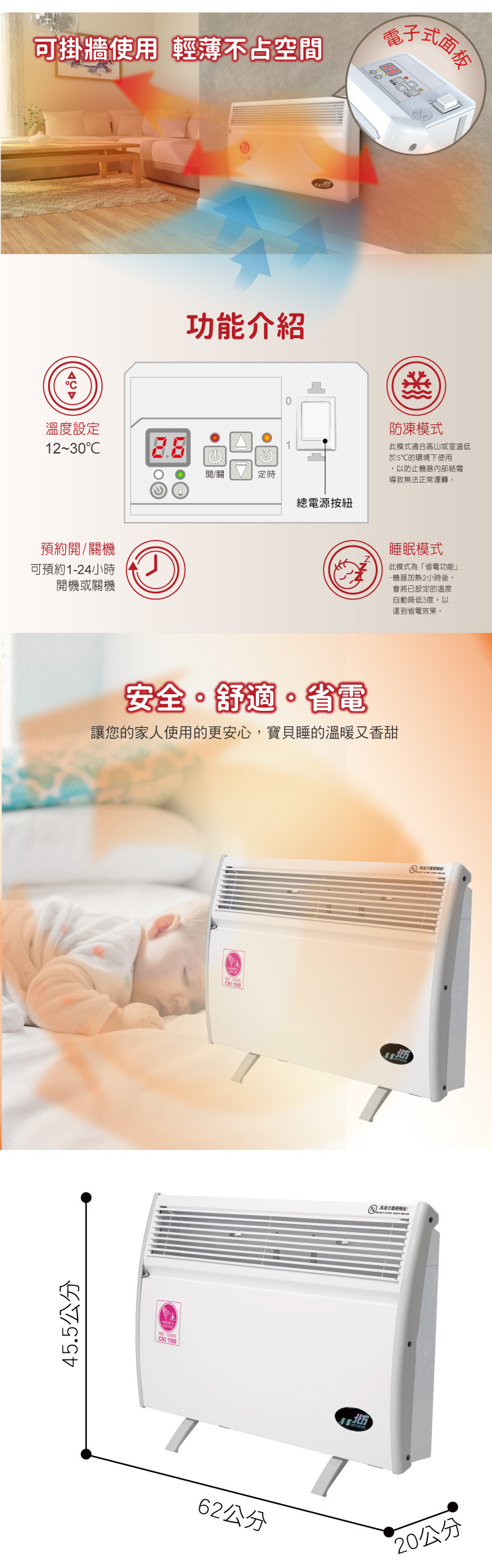 ●LED顯示螢幕●適用5~8坪●12~30℃溫度調整●IP24防潑水檢測●1-24小時預約開關機設定●睡眠模式設定●傾倒自動斷電保護●U型鋼鋁合金加熱元件提供五年保固服務(限2024年後(含)生產的機器)
