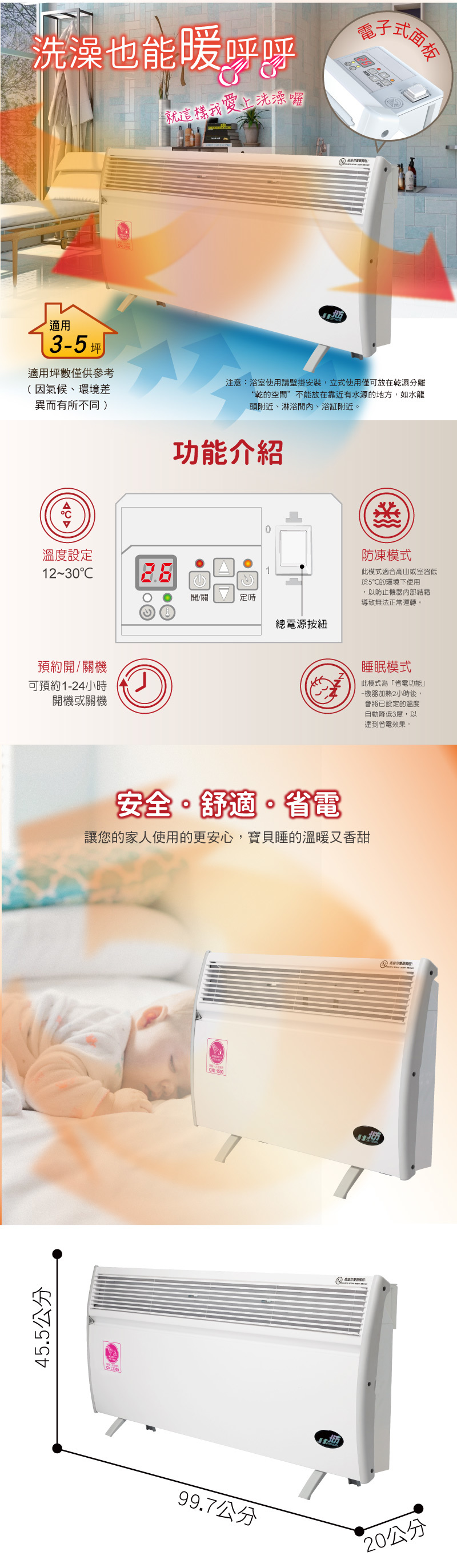 ●LED顯示螢幕●適用8~12坪●12~30℃溫度調整●IP24防潑水檢測●1-24小時預約開關機設定●睡眠模式設定●傾倒自動斷電保護●U型鋼鋁合金加熱元件提供五年保固服務(限2024年後(含)生產的機器)