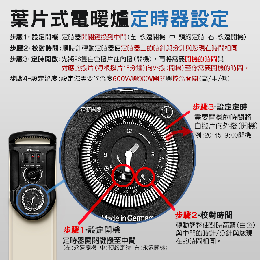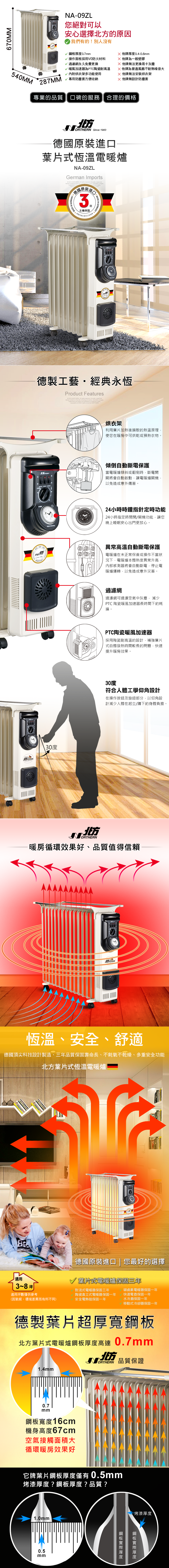 ●9葉片5段式散熱,適用3-8坪 ●PTC陶瓷暖風加速器 ●異常高溫/防傾倒自動斷電保護 ●恆溫省電裝置 ●24小時時鐘指針定時功能 ●附烘衣架、防塵套
