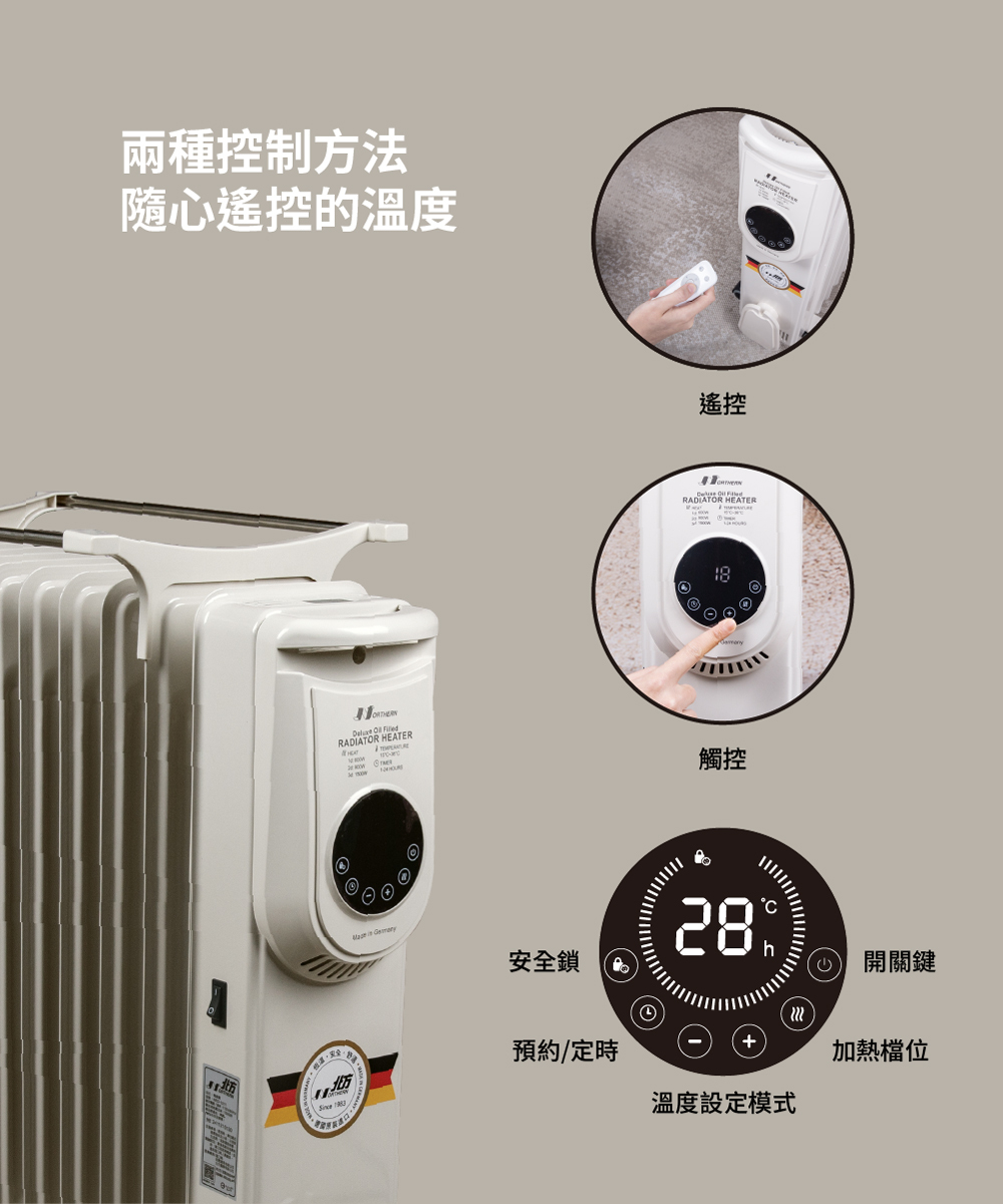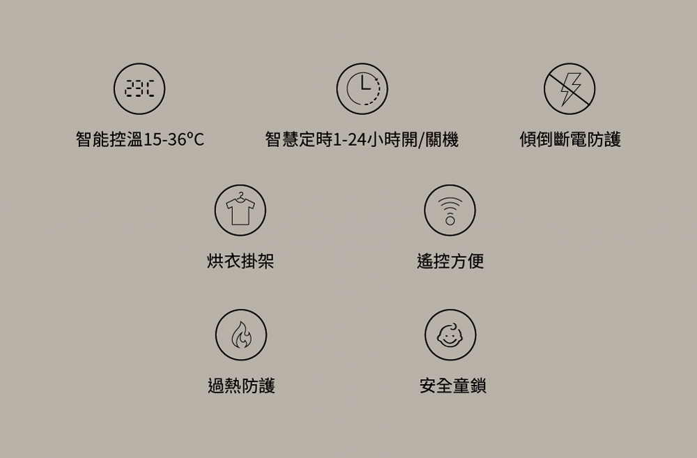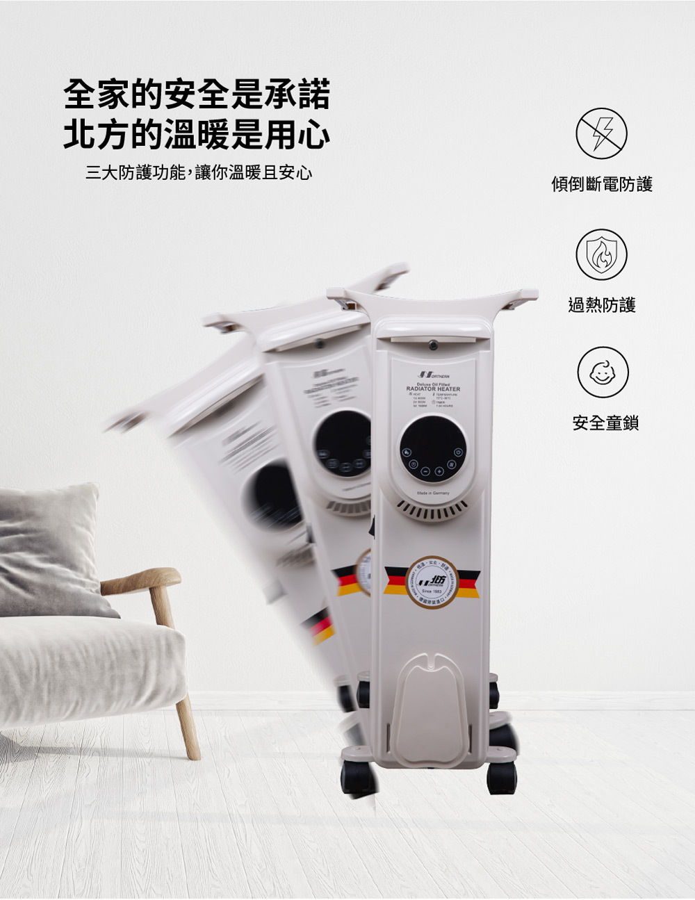 ●9葉片散熱,均勻提升室內溫度●適用3~8坪● 電子式LED液晶觸控螢幕● 高、中、低、溫度設定四種模式設定 (溫度設定範圍15-36℃)●異常高溫/防傾倒自動斷電保護 ● 1-24小時預約開/關機設定● 附紅外線遙控器/烘衣架● 恆溫、省電、舒適、無噪音