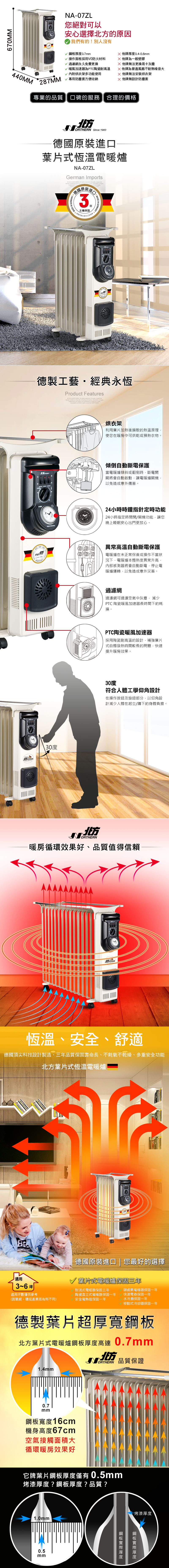 ●7葉片5段式散熱,適用3-6坪 ●PTC陶瓷暖風加速器 ●異常高溫/防傾倒自動斷電保護 ●恆溫省電裝置 ●24小時時鐘指針定時功能 ●附烘衣架、防塵套