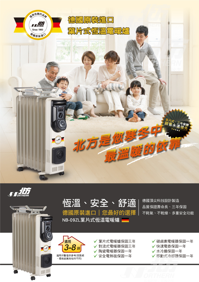●9葉片5段式散熱,適用3-8坪 ●PTC陶瓷暖風加速器 ●異常高溫/防傾倒自動斷電保護 ●恆溫省電裝置 ●24小時時鐘指針定時功能 ● 附贈烘衣架款式隨機出貨、防塵套