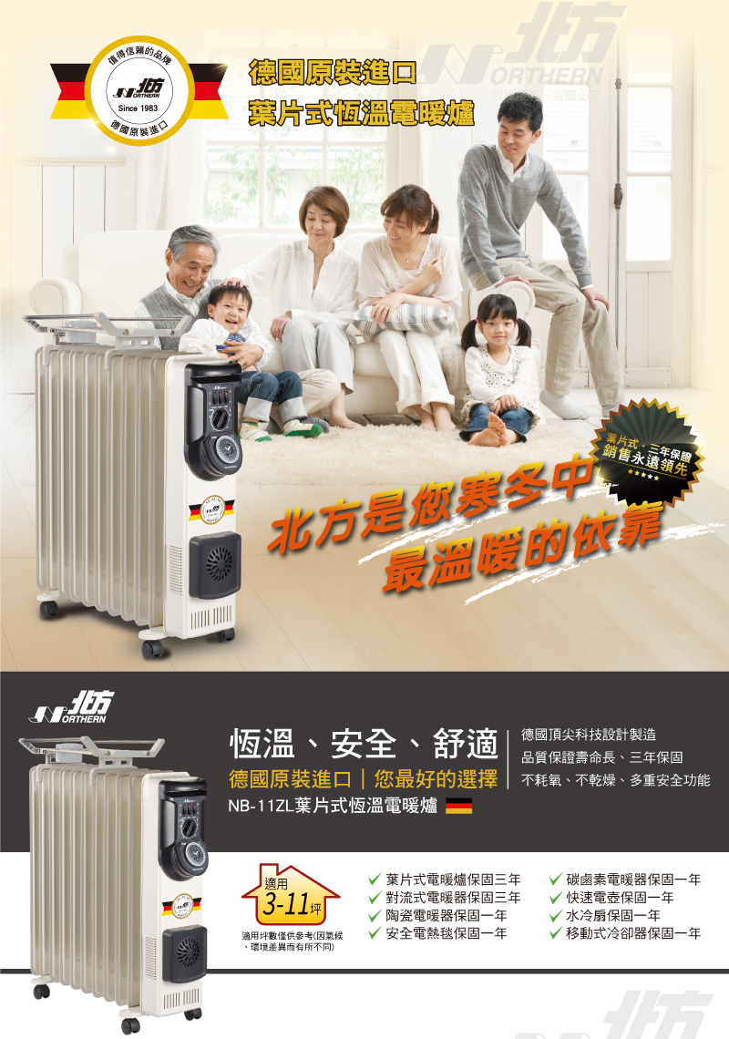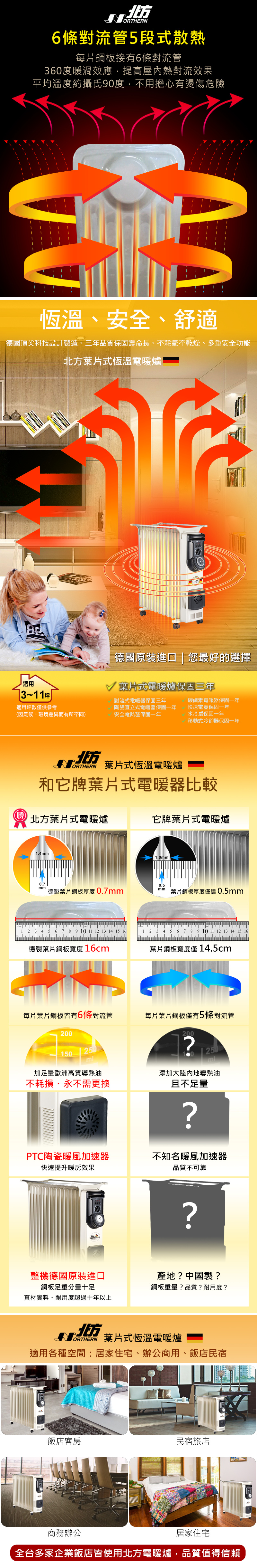 ●11葉片5段式散熱,適用3-11坪 ●24小時定時開關器 ●PTC陶瓷暖風加速器 ●恆溫省電裝置 ●傾倒自動斷電安全設計 ●異常高溫自動斷電安全設計 ●便利式電線收納架 ● 附贈烘衣架款式隨機出貨、防塵套