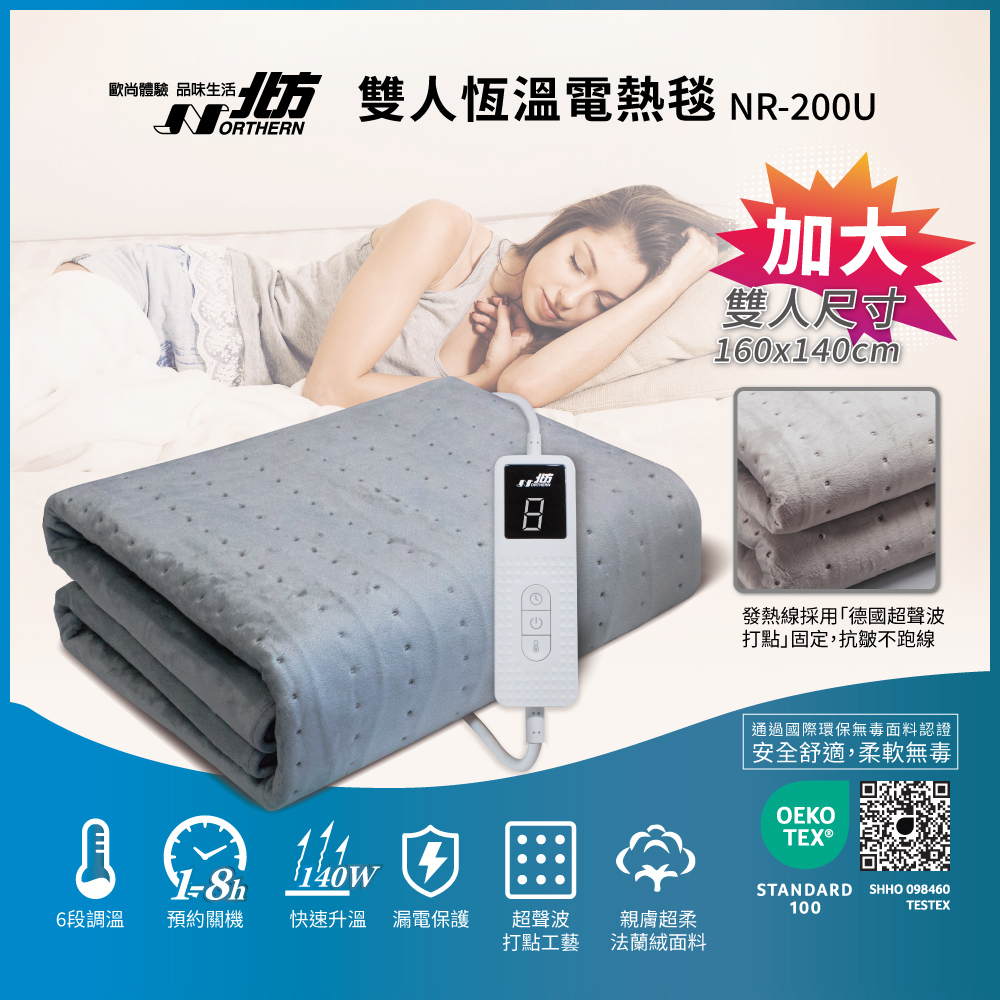 ●雙人尺寸:約160*140cm/單人尺寸:約150*90cm●採用德國超聲波打點技術,發熱線更服貼、不易位移●1-8小時預約關機●8小時自動斷電功能●四重安全防護●1~6段溫度調整●採用OEKO-TEX認證安全無毒面料,親膚安全舒適