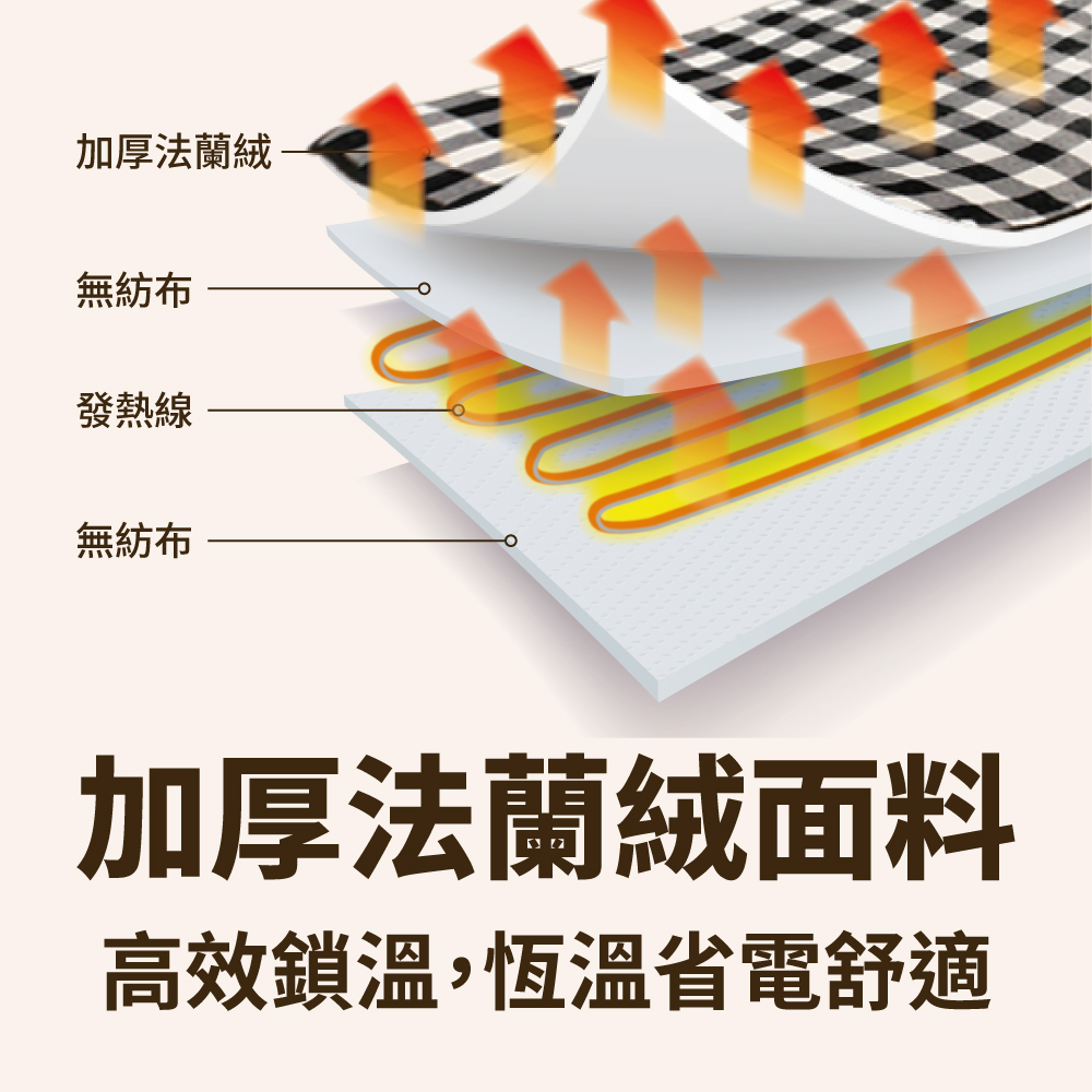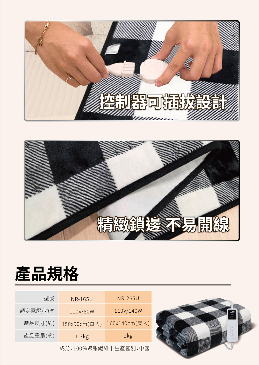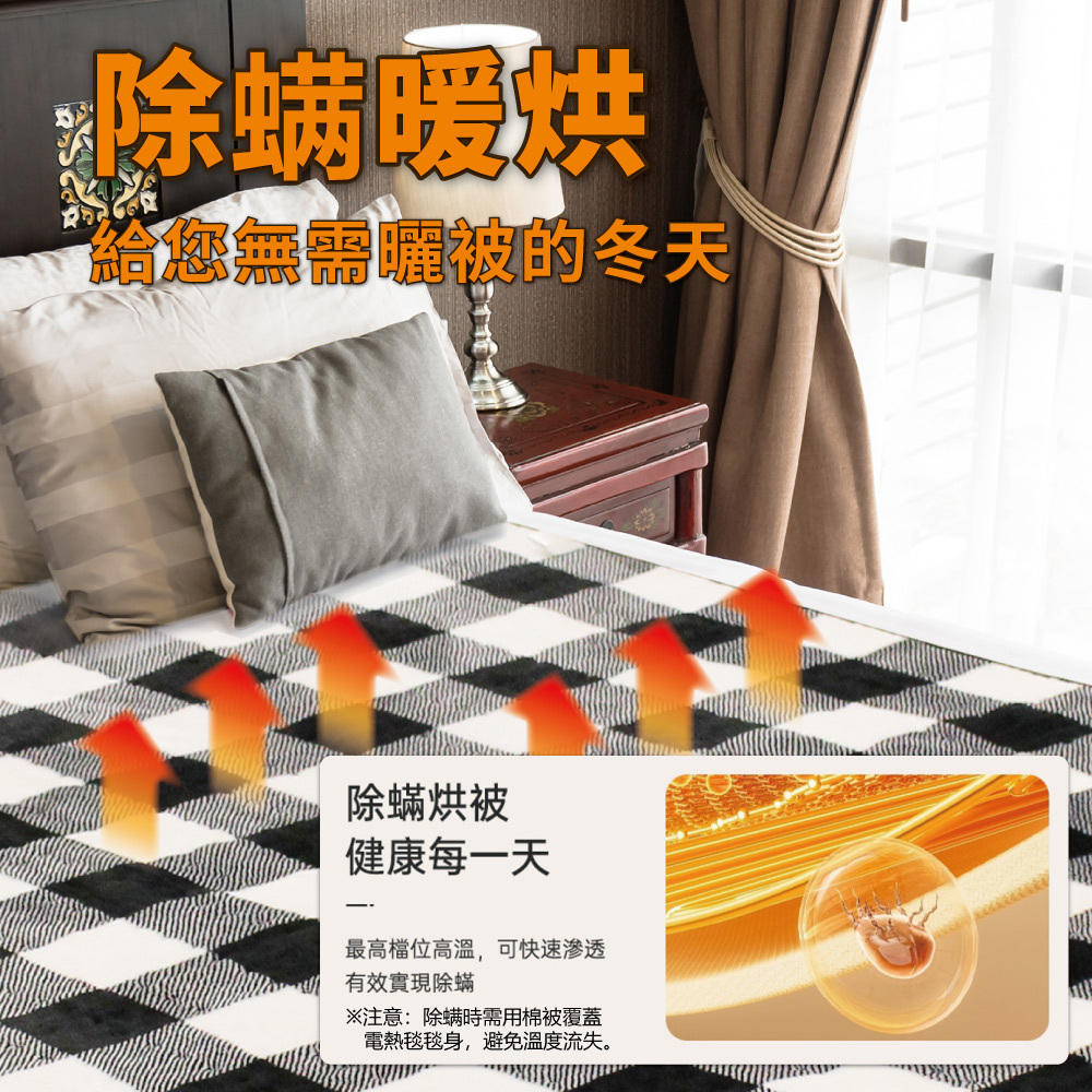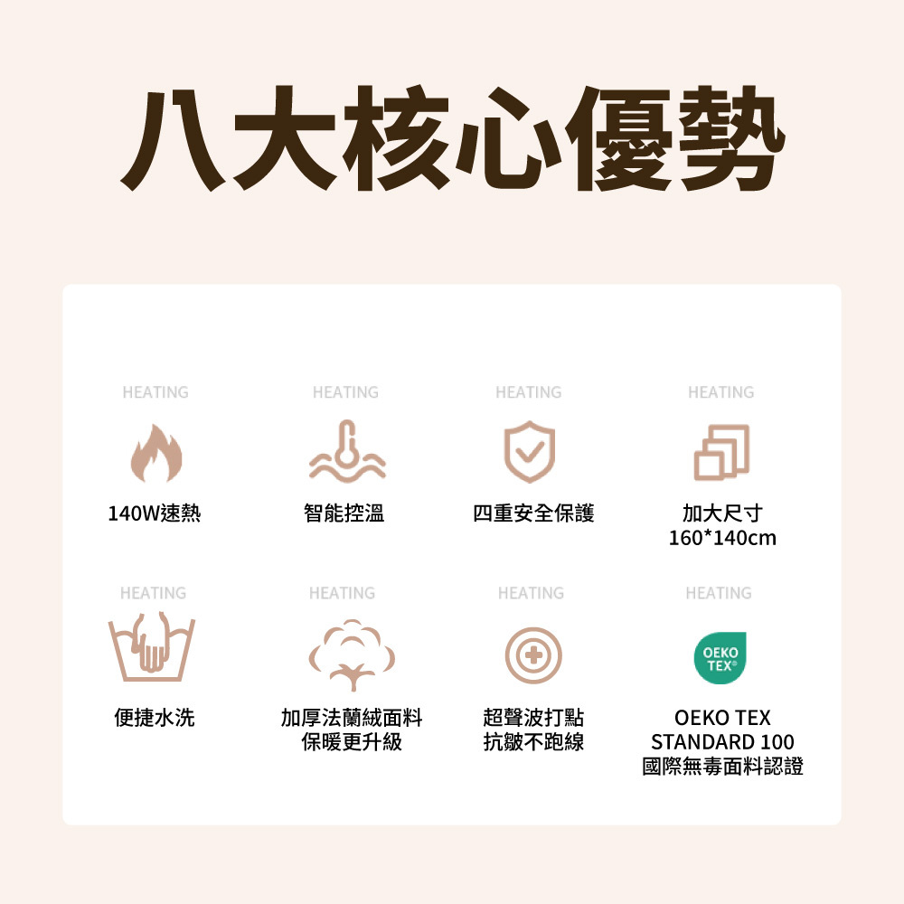 ●雙人尺寸:約160*140cm/單人尺寸:約150*90cm●採用德國超聲波打點技術,發熱線更服貼、不易位移●1-8小時預約關機●8小時自動斷電功能●四重安全防護●1~6段溫度調整●採用OEKO-TEX認證安全無毒面料,親膚安全舒適