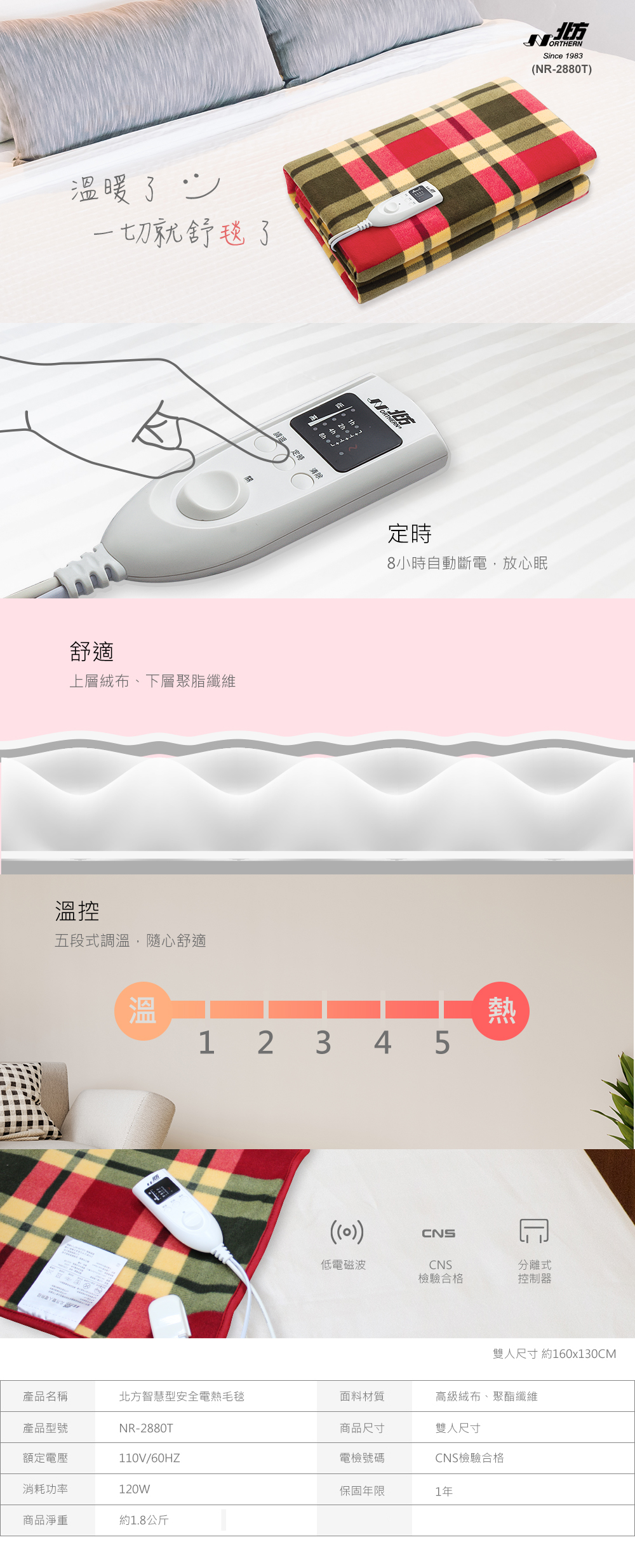 ●可設定1-8小時自動斷電●微電腦控溫.恆溫省電●過熱安全自動斷電保護●五段式溫度調整●低電磁波●雙人尺寸130x160cm