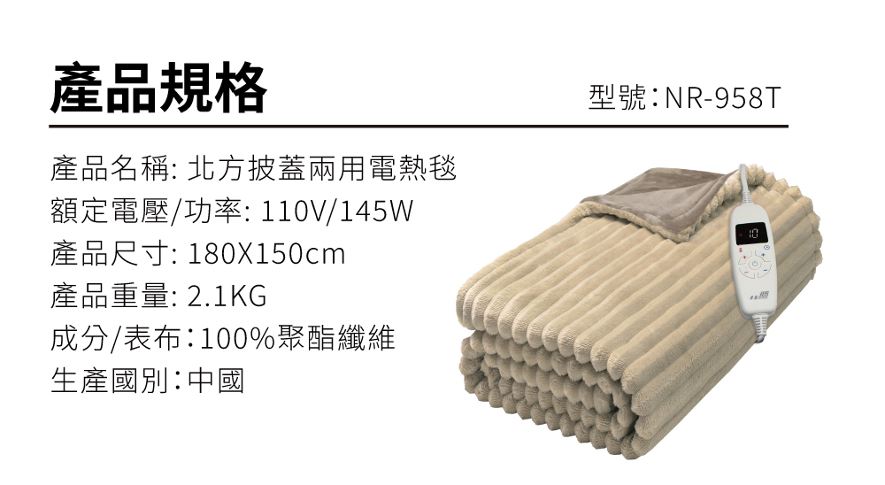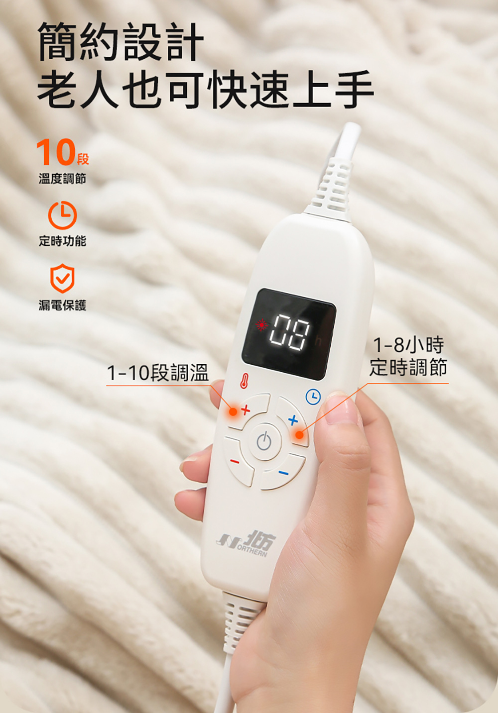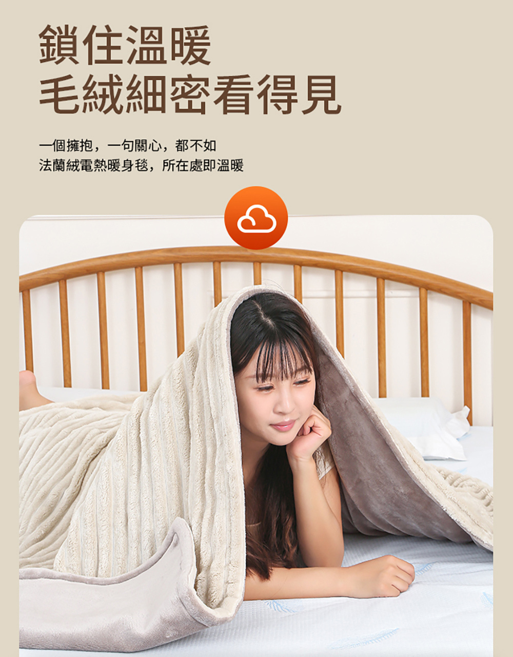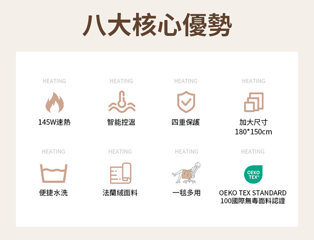 ●尺寸:180*150cm ●加厚抽條法蘭絨,厚實保暖 ●可設定1-8小時自動斷電 ●1-10段溫度調節,節能又舒適 ●過熱安全自動斷電保護 ●通過中華民國CNS檢驗合格 ● 通過國際環保無毒面料認證