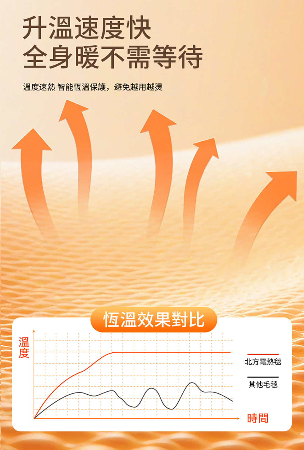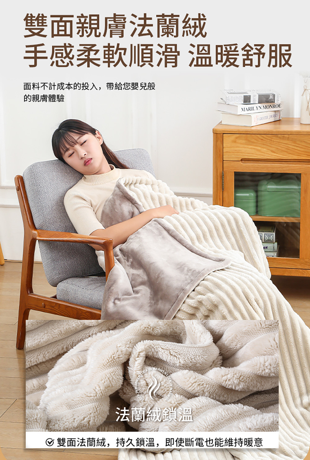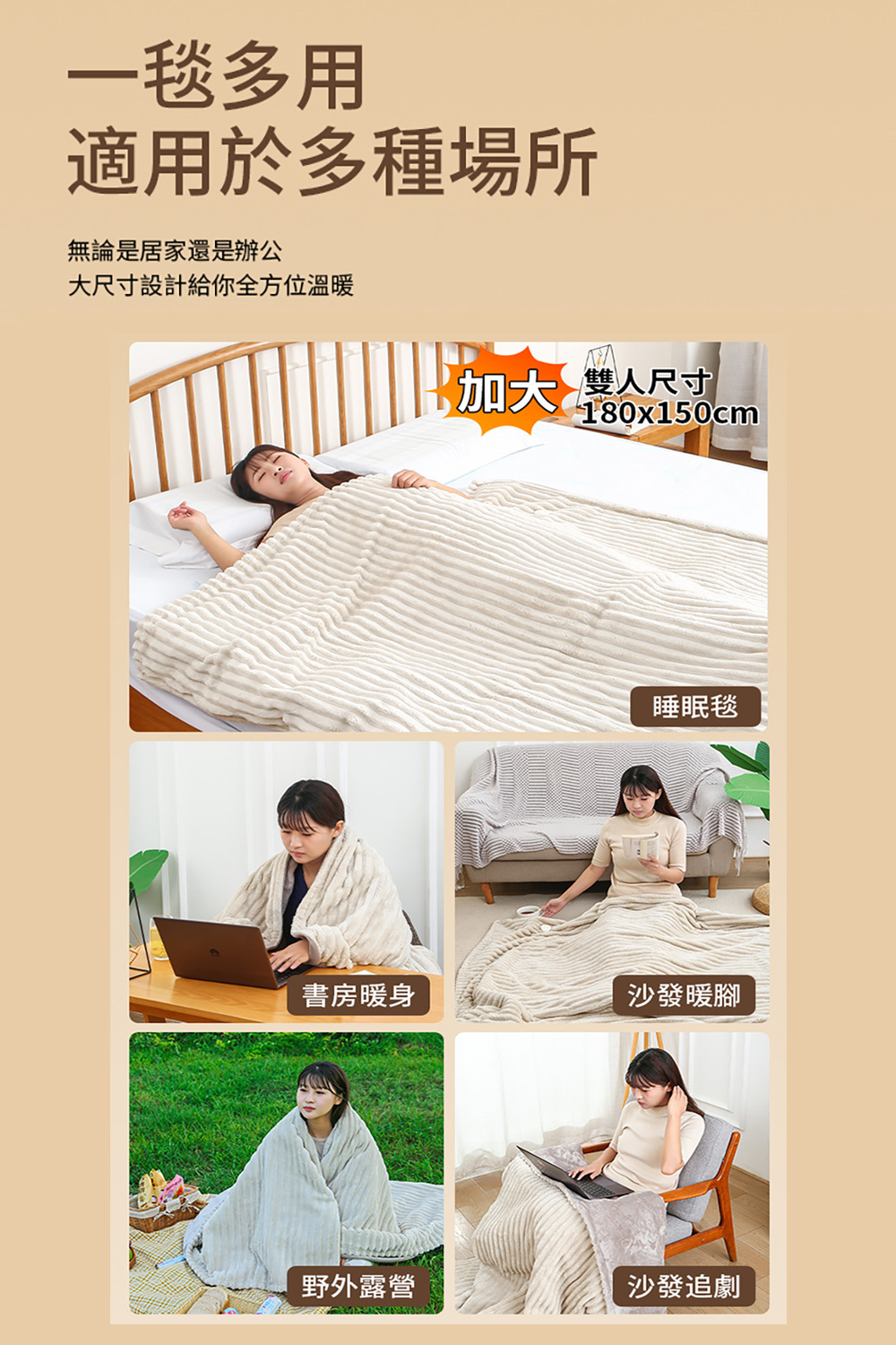 ●尺寸:180*150cm ●加厚抽條法蘭絨,厚實保暖 ●可設定1-8小時自動斷電 ●1-10段溫度調節,節能又舒適 ●過熱安全自動斷電保護 ●通過中華民國CNS檢驗合格 ● 通過國際環保無毒面料認證