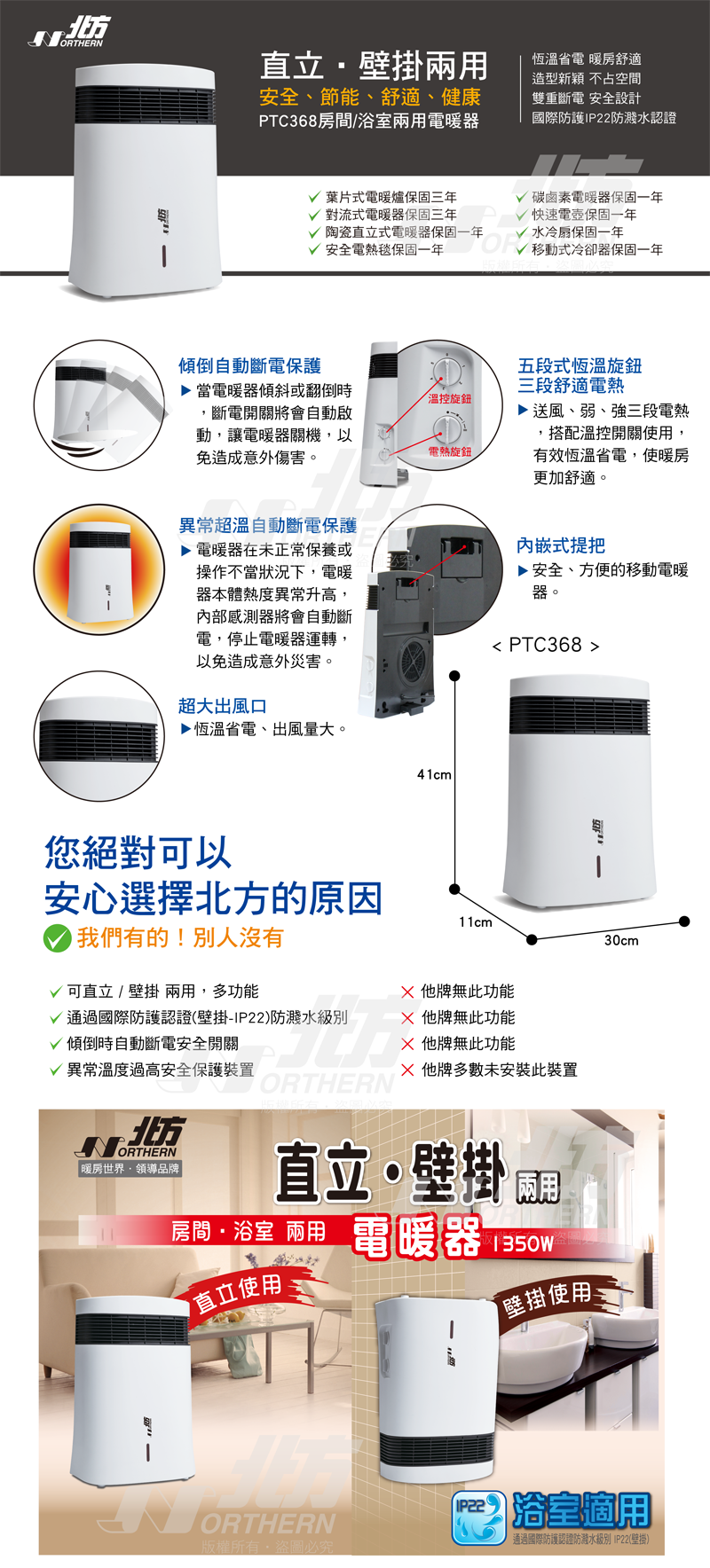●座式.壁掛兩用.恆溫省電.異常超溫自動斷電保護.三段舒適風速.無段式溫控旋鈕.國際防護IP22防潑水認證